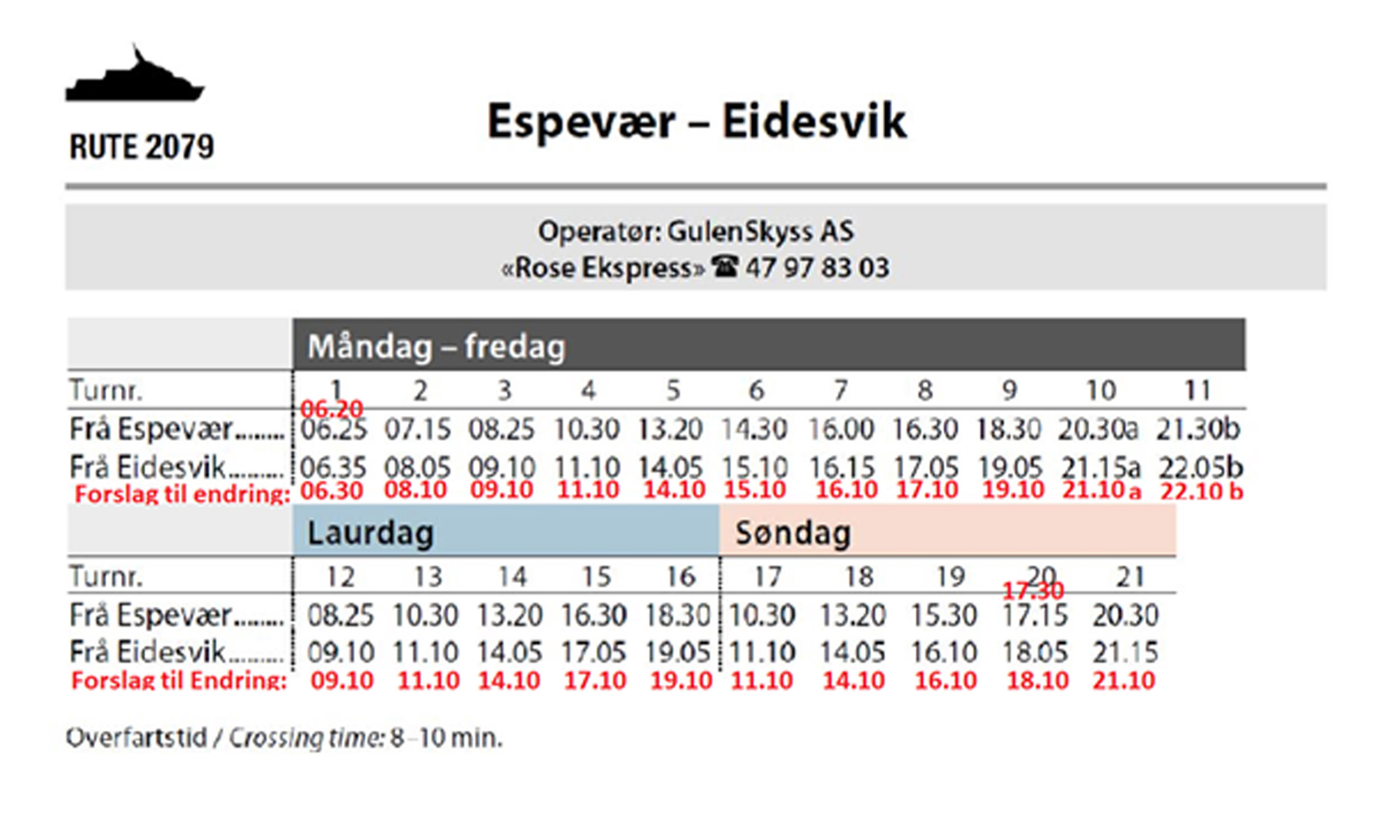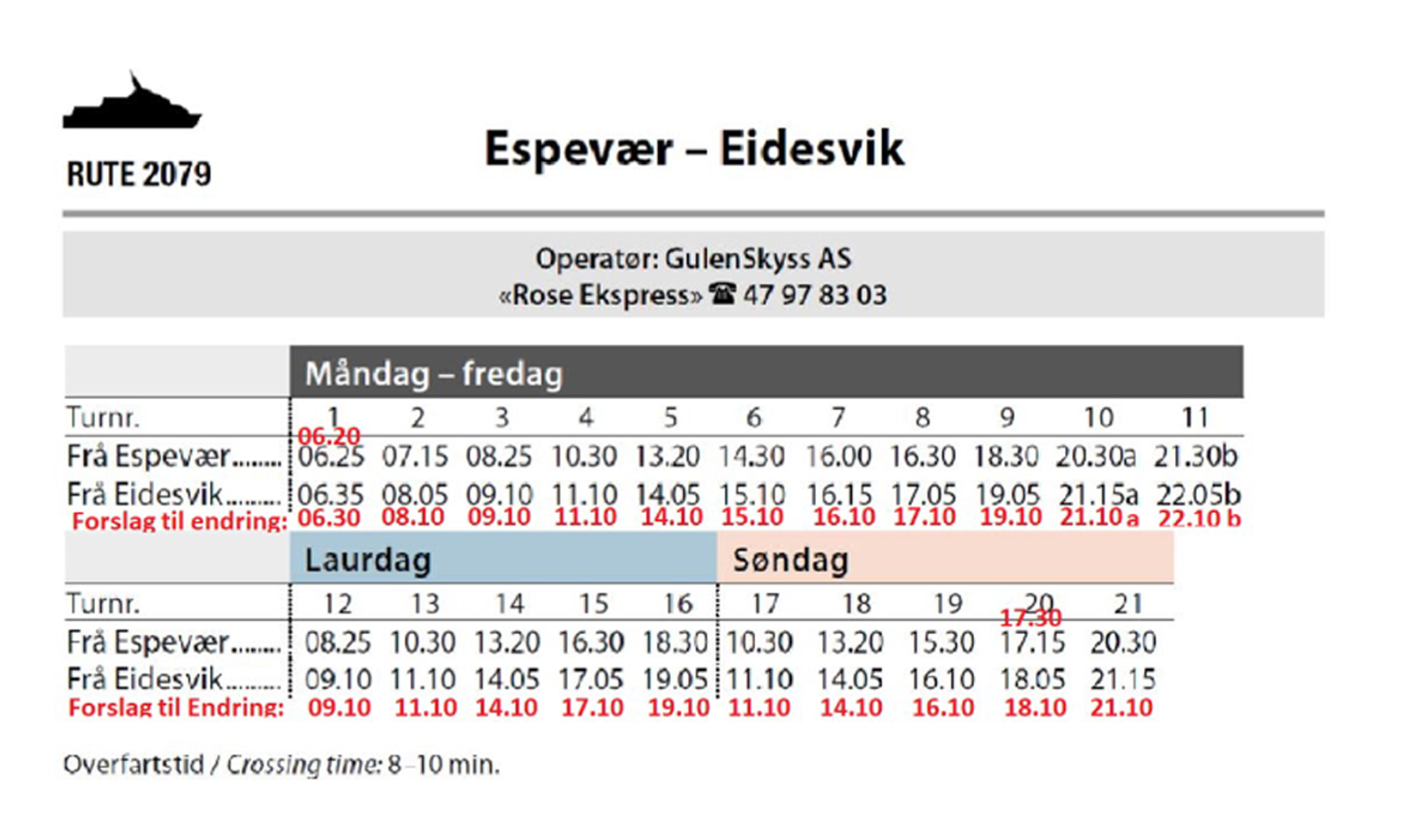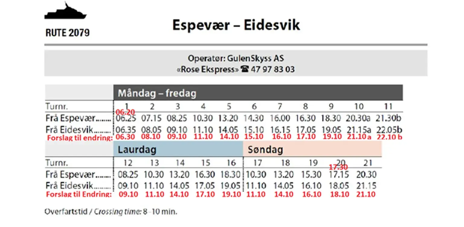 Skyssbåt Eidesvik - Espevær, Rutetider